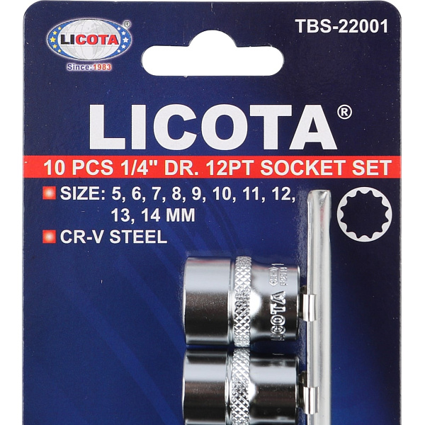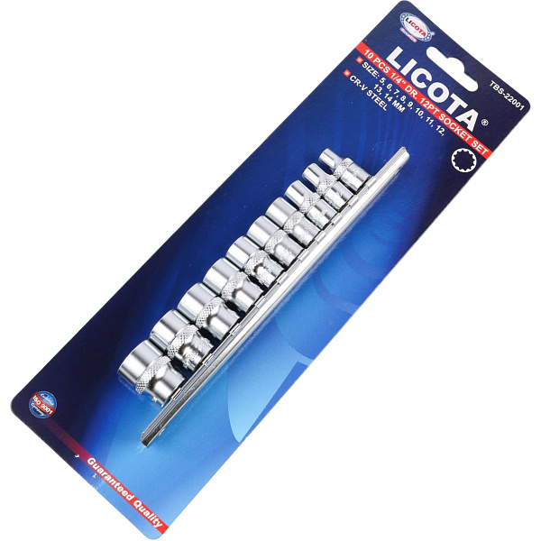 Набор торцевых головок 1/4" 12-ти гранных, 10 пр. на линейке, 5-14 мм, Licota, TBS-22001