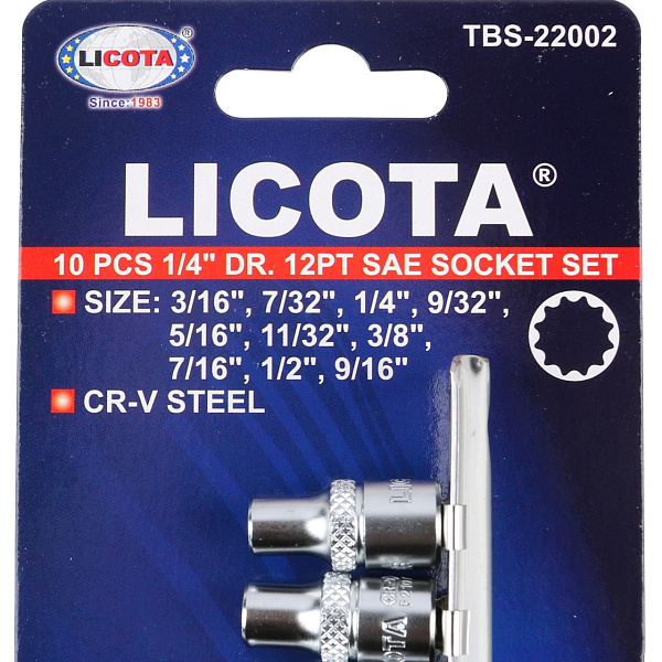 Набор торцевых головок 1/4" 12-ти гранных, 10 пр. на линейке, 3/16"-9/16", Licota, TBS-22002