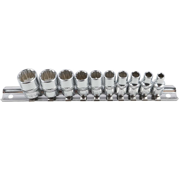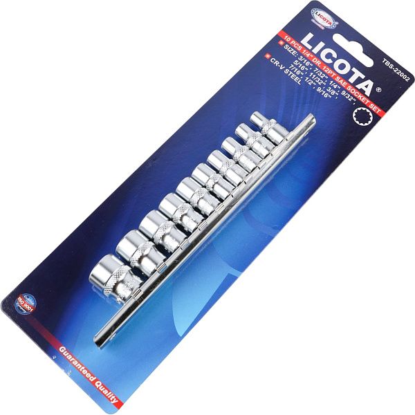 Набор торцевых головок Licota TBS-22002 из хром-ванадиевой стали предназначен для ручного монтажа/демонтажа резьбового крепежа дюймовых размеров. Набор из 10 предметов на металлическом держателе-линейке.