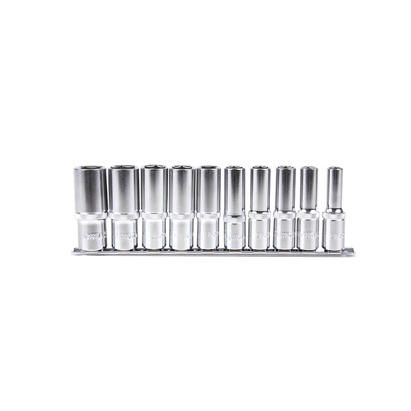 Набор глубоких торцевых головок Licota TBS-23002 из хром-ванадиевой стали предназначен для ручного монтажа/демонтажа резьбового крепежа дюймовых размеров. Набор из 10 предметов на металлическом держателе-линейке.
