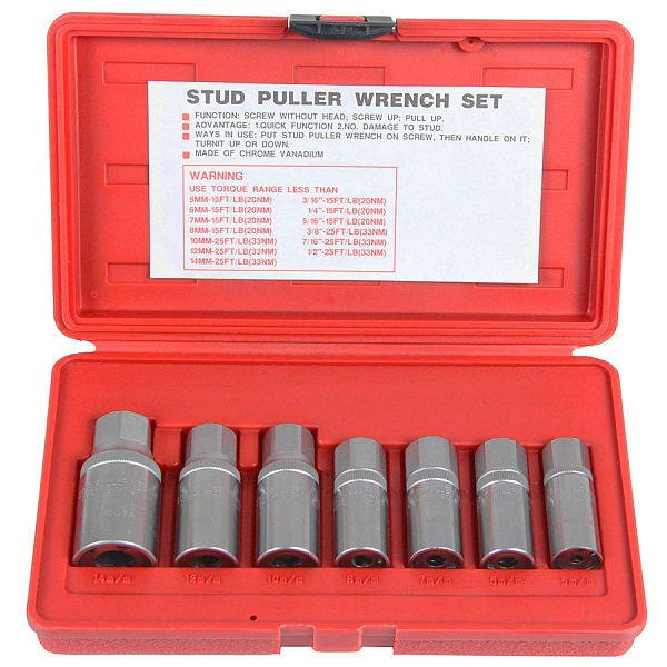 Размер привода: 1/2". Диапазон диаметров шпилек: 5-14 мм. Максимальный момент для размеров 5-8 мм: 20 Нм; 10-14 мм: 33 Нм.