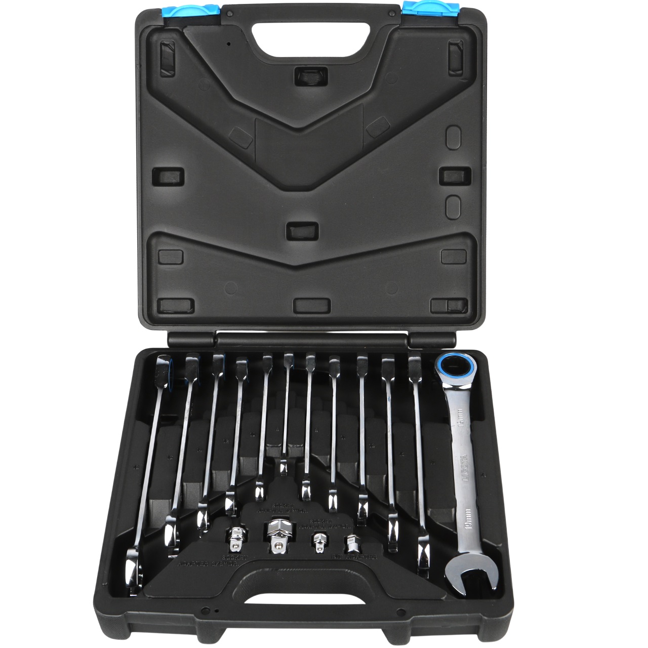 Набор ключей трещоточных комбинированных 72 зуба 8-19 мм + 4 переходника, 16 предметов в пластиковом кейсе