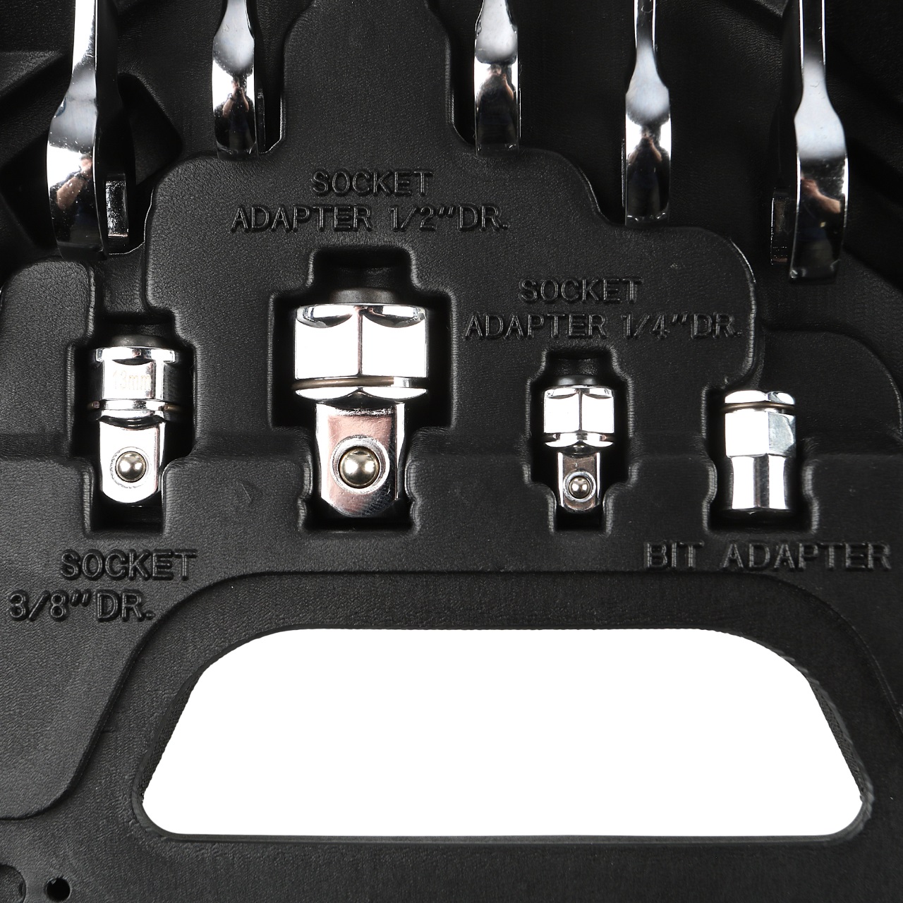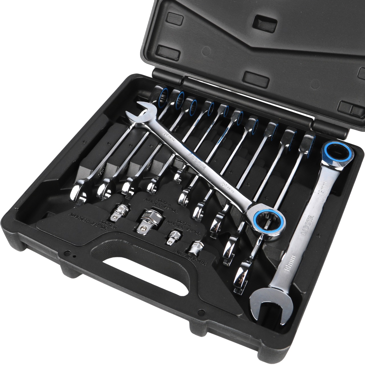 Набор ключей трещоточных комбинированных 72 зуба 8-19 мм + 4 переходника, 16 предметов в пластиковом кейсе