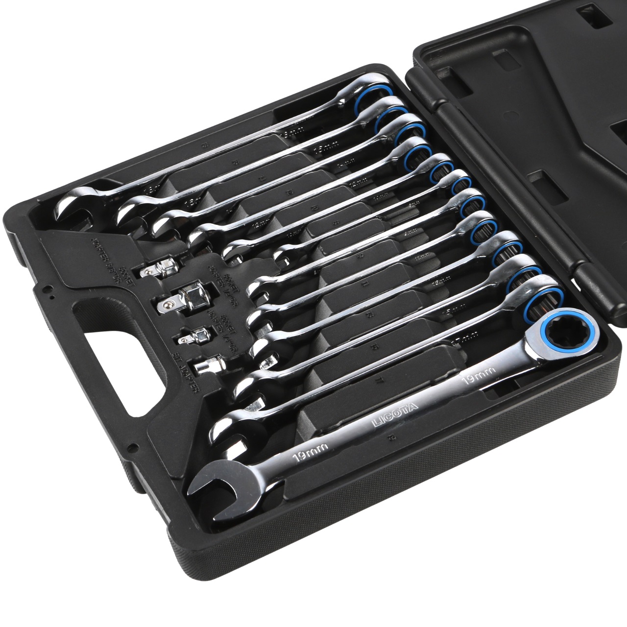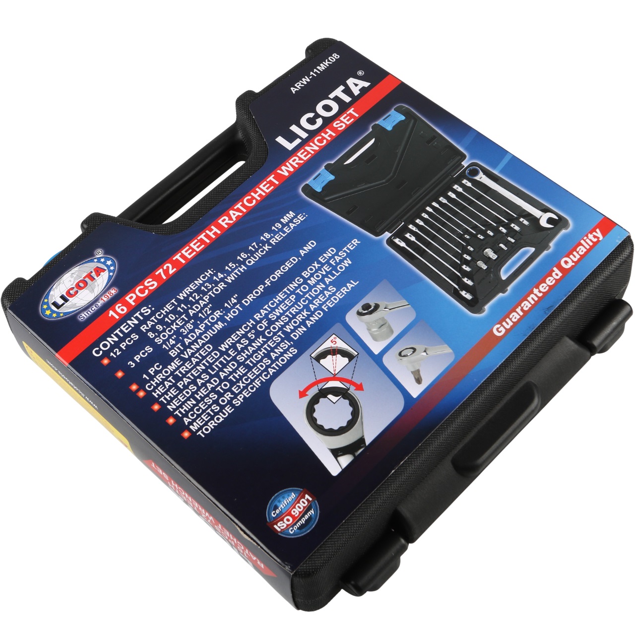 Набор комбинированных шарнирных ключей с трещоткой Licota ARW-11MK08 с рожковым и накидным профилем. Комплект состоит из 16 предметов: 12 ключей и четырёх адаптеров (три для торцевых головок и один для бит).