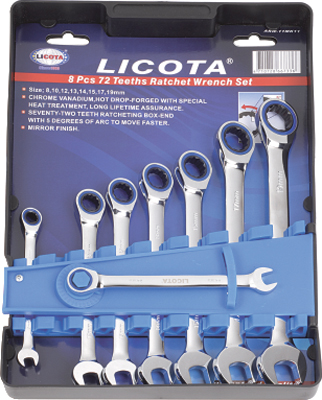 Набор ключей трещоточных комбинированных 72 зуба 8-19 мм, 8 предметов на пластиковом держателе