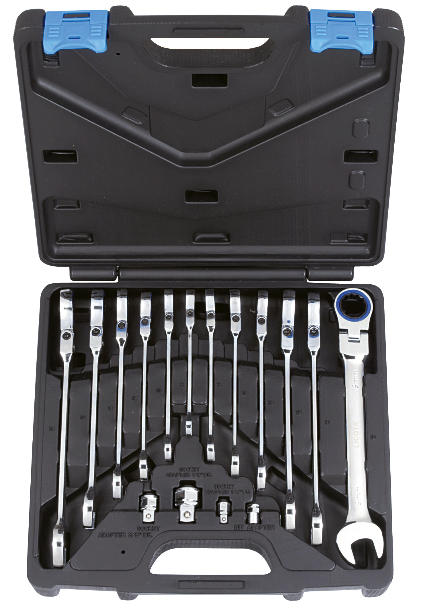 Набор комбинированных трещоточных шарнирных ключей Licota ARW-12MK09 применяется для монтажа и демонтажа резьбовых соединений. У ключей этого типа есть храповой механизм (трещотка) и шарнир. В комплекте с ключами идёт три адаптера под торцевые головки и один — под биты.