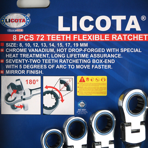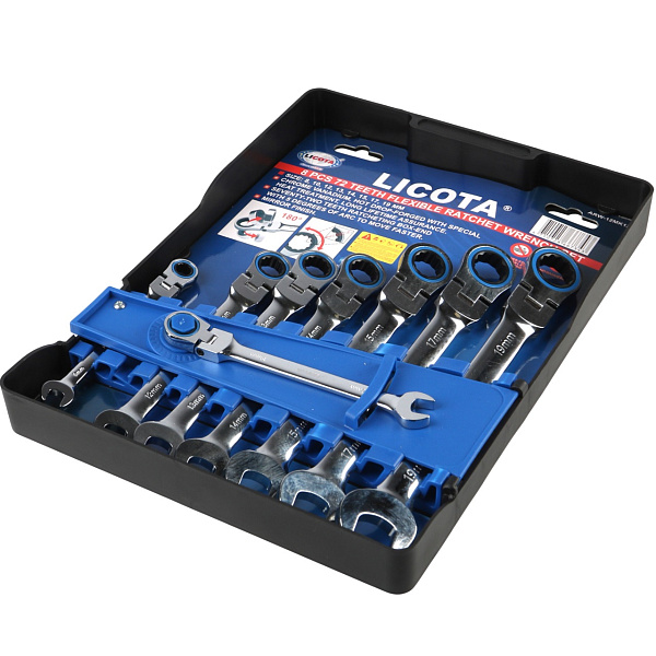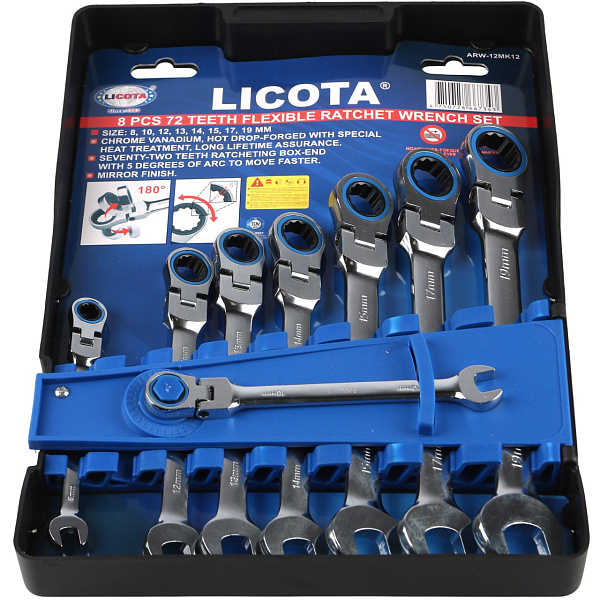 Набор ключей трещоточных комбинированных гибких 72 зуба 8-19 мм, 8 пр. на пластиковом держателе