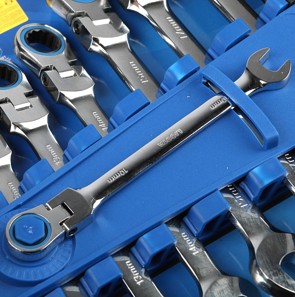Комбинированные трещоточные шарнирные ключи в наборе выполнены из закаленной хром-ванадиевой стали. Эта комбинация обеспечивает высокую прочность, и способность переносить сильные длительные нагрузки без нарушения геометрии инструмента.