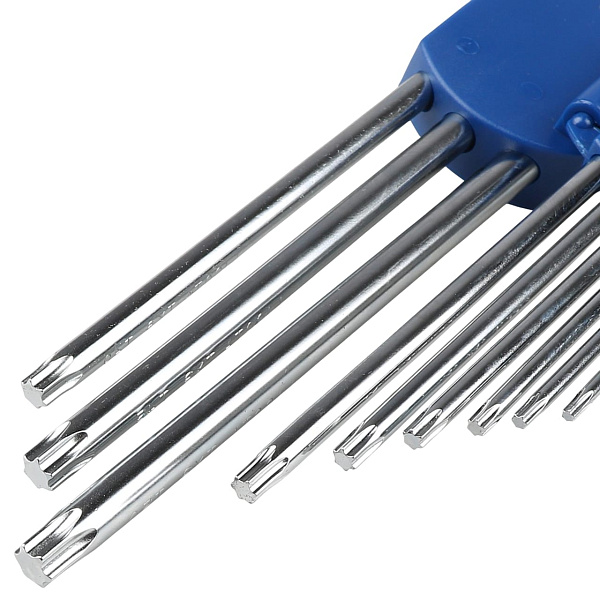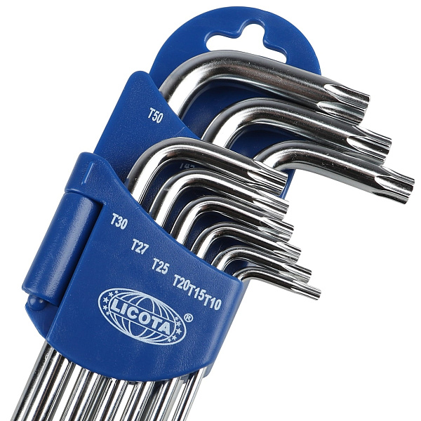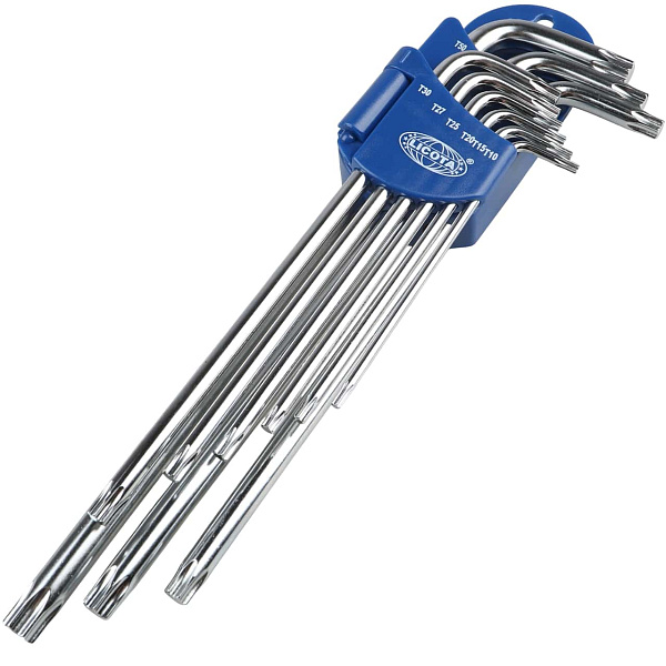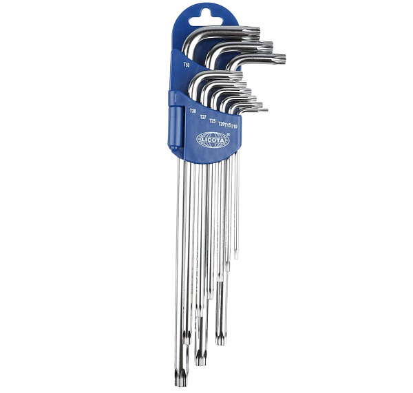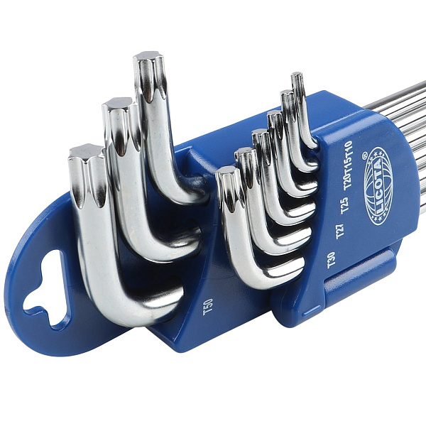 Набор ключей угловых (имбусовых) экстра длинных Licota 2TX30091DPM для работы с крепежом с внутренним профилем Torx. Набор из 9 ключей размерами от T10 до T50 мм.