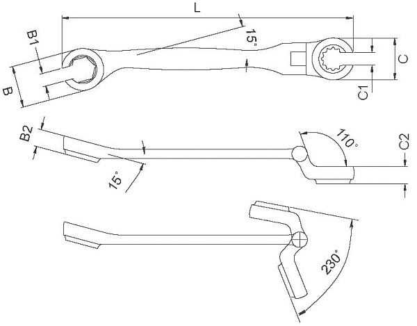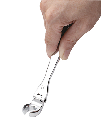 Матовая поверхность обеспечивает надежный хват и препятствует выскальзыванию инструмента из рук. Одна из головок крепится к рукоятке гибким шарниром, что значительно облегчает монтаж/демонтаж в ограниченном пространстве, где угол поворота ключа ограничен. Профиль из 12 граней подходит к головкам болтов и гайкам как 6-, так и 12-гранного профиля.