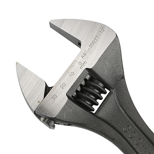 Высокоточная обработка червячного механизма сводит к минимуму люфт зева. На рабочую часть ключа нанесена разметка, позволяющая точно выставить размер зева или, при необходимости, использовать ключ как штангенциркуль. Отверстие на конце рукоятки позволяет подвесить инструмент в удобном месте, чтобы он всегда был под рукой.