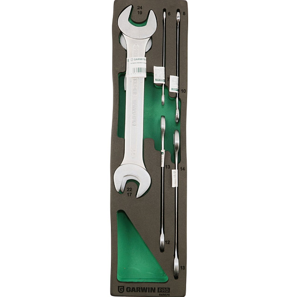 Набор ключей комбинированных GARWIN PRO 646073 в ложементе предназначен для монтажа и демонтажа резьбовых соединений. Комплект инструментов состоит из 18 ключей с двумя рабочими профилями — рожковым и накидным, размеры от 6 до 24 мм.