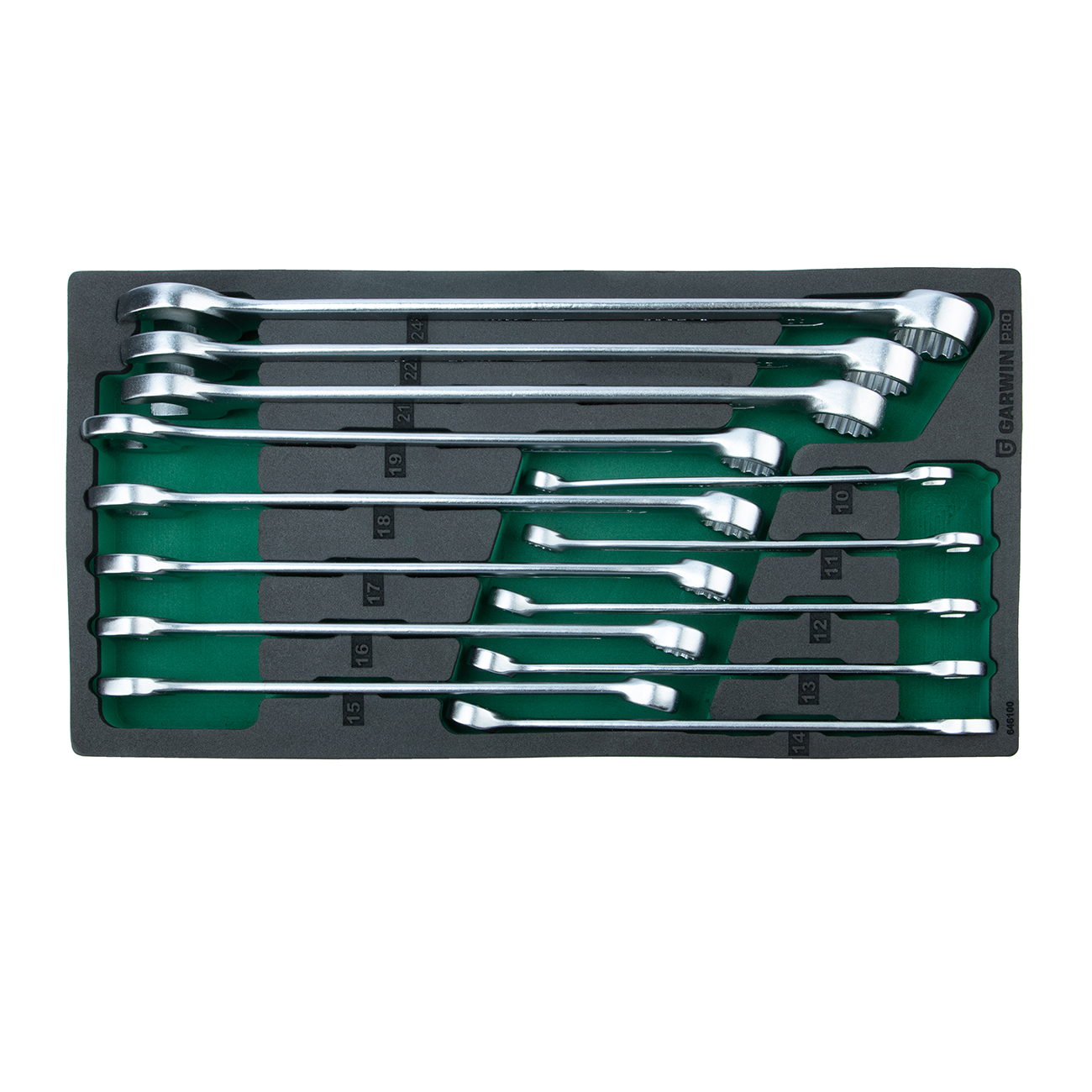Набор ключей комбинированных удлиненных GARWIN PRO 646100 предназначен для монтажа и демонтажа резьбовых соединений. Комплект ключей подойдет для работы в автомастерских, на производстве и дома, для бытовых работ. Комплект инструментов состоит из 13 ключей с двумя рабочими профилями — рожковым и накидным, причем накидными ключами можно работать с гайками и ключами как 12-, так и 6-гранного профиля.