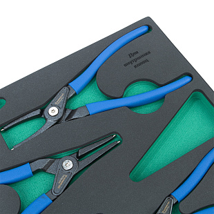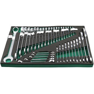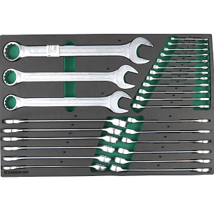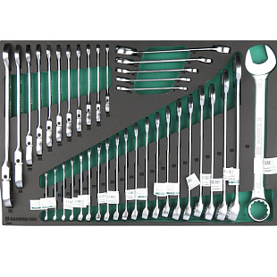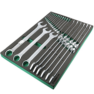 Набор гаечных ключей поставляется в ложементе из синтетического каучука (EVA). Это легкий, прочный и эластичный материал, не разлагающийся от технических масел и жидкостей. Инструменты прочно зафиксированы в ложементе, позволяет хранить набор в ящиках инструментальной тележки или верстака.