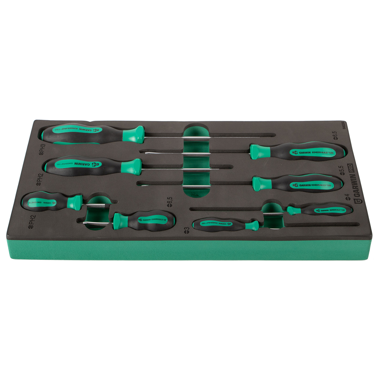 Набор профессиональных отверток GARWIN PRO 646255 из 8 предметов в ложементе EVA. В комплект входят 5 отвертки с профилем SL (шлиц) и 3 отвертки с профилем PH (крест).