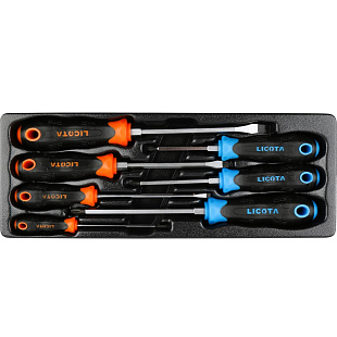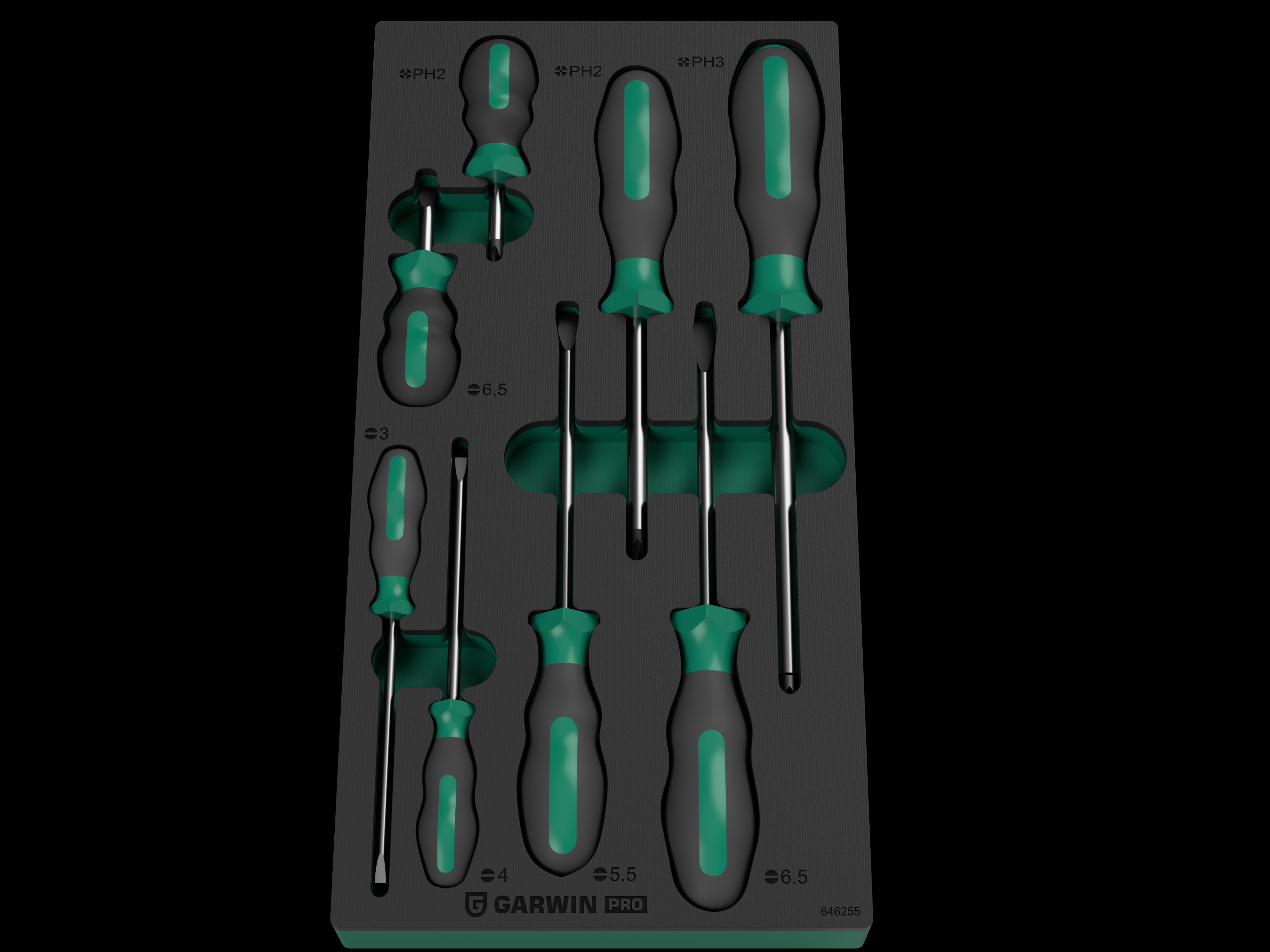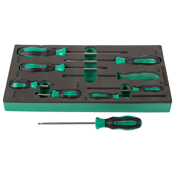 Набор профессиональных отверток GARWIN PRO 646255 из 8 предметов в ложементе EVA. В комплект входят 5 отвертки с профилем SL (шлиц) и 3 отвертки с профилем PH (крест).
