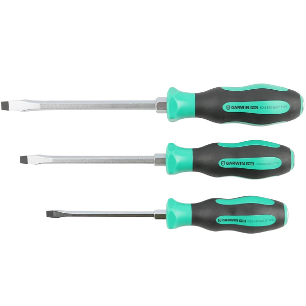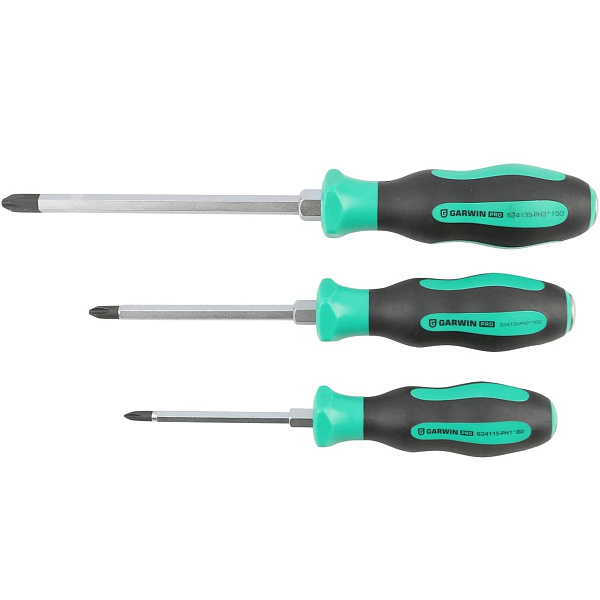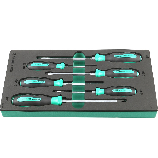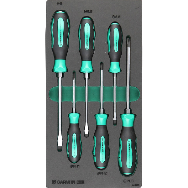 Набор цельнометаллических отверток GARWIN PRO 646265 из 6 предметов в ложементе EVA. В комплект входят 3 отвертки с профилем SL (шлиц) и 3 отвертки с профилем PH (крест).