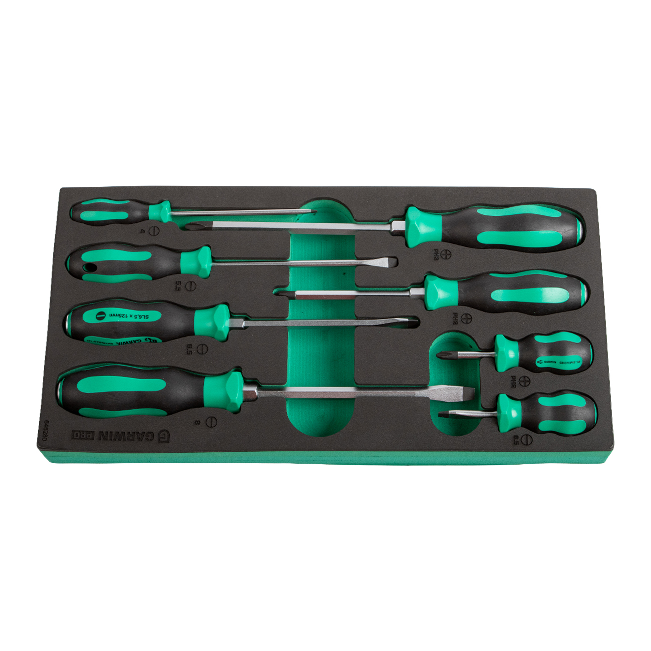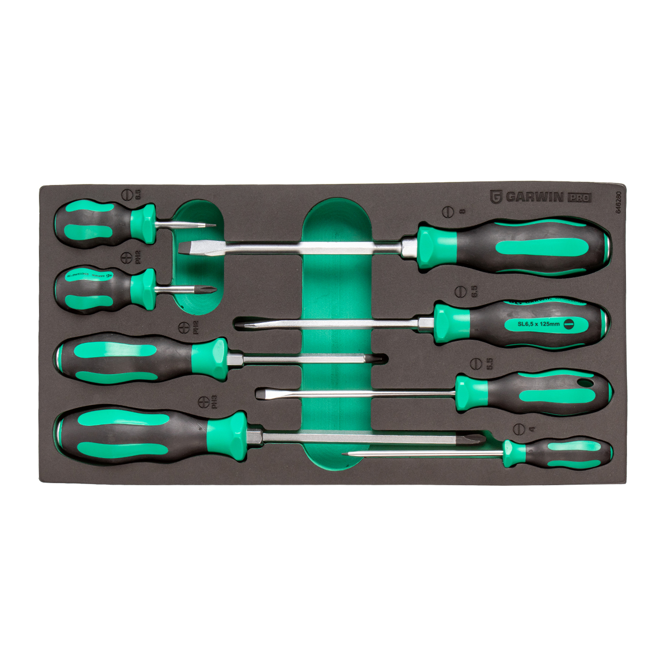 Набор цельнометаллических отверток GARWIN PRO 646067 из 8 предметов в ложементе EVA. В комплект входят 5 отверток с профилем SL (шлиц) и 3 отвертки с профилем PH (крест).