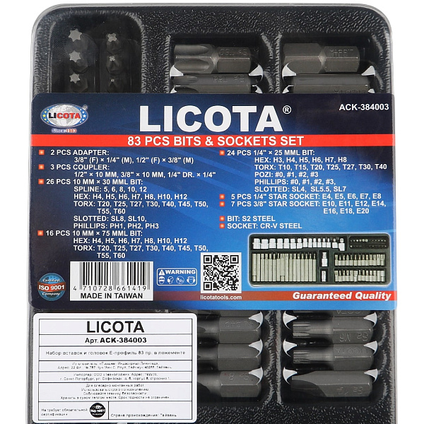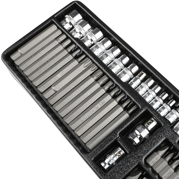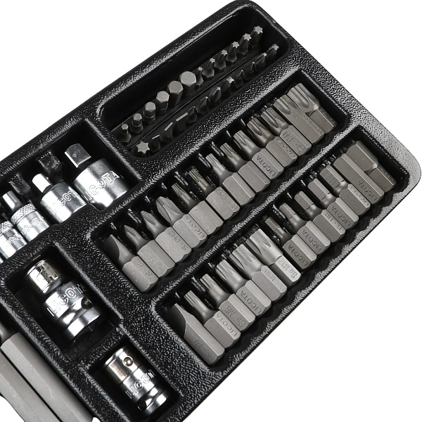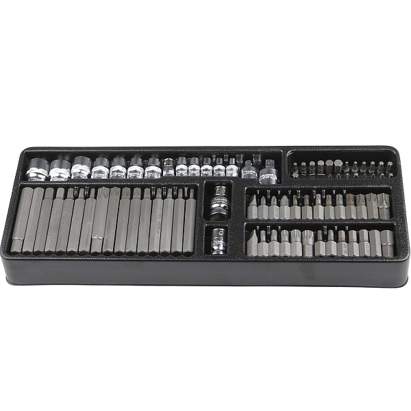Набор включает в себя широкий ассортимент стандартных и глубоких бит различных профилей и адаптеров для них, а также торцевых головок и переходников.