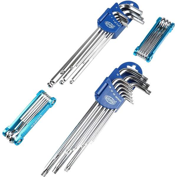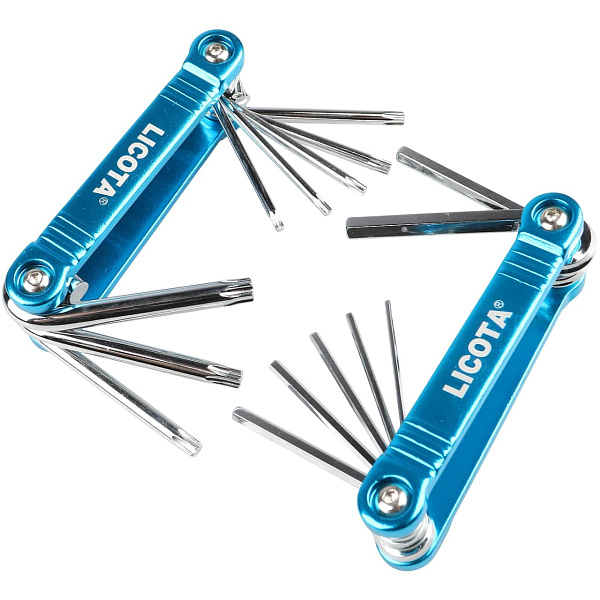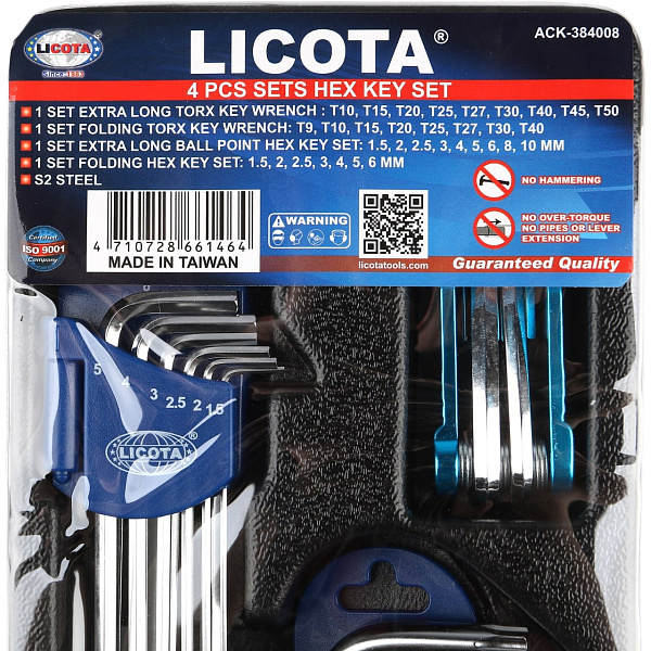 Набор ключей Licota ACK-384008. Комплект из 4 отдельных наборов угловых (имбусовых) и раскладных ключей с рабочими профилями HEX и Torx.