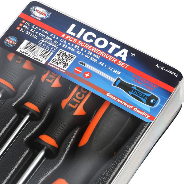 Набор профессиональных отверток Licota ACK-384014 из 8 предметов в ложементе. В комплект входят 4 отвертки с профилем SL (шлиц) и 4 отвертки с профилем PH (крест).