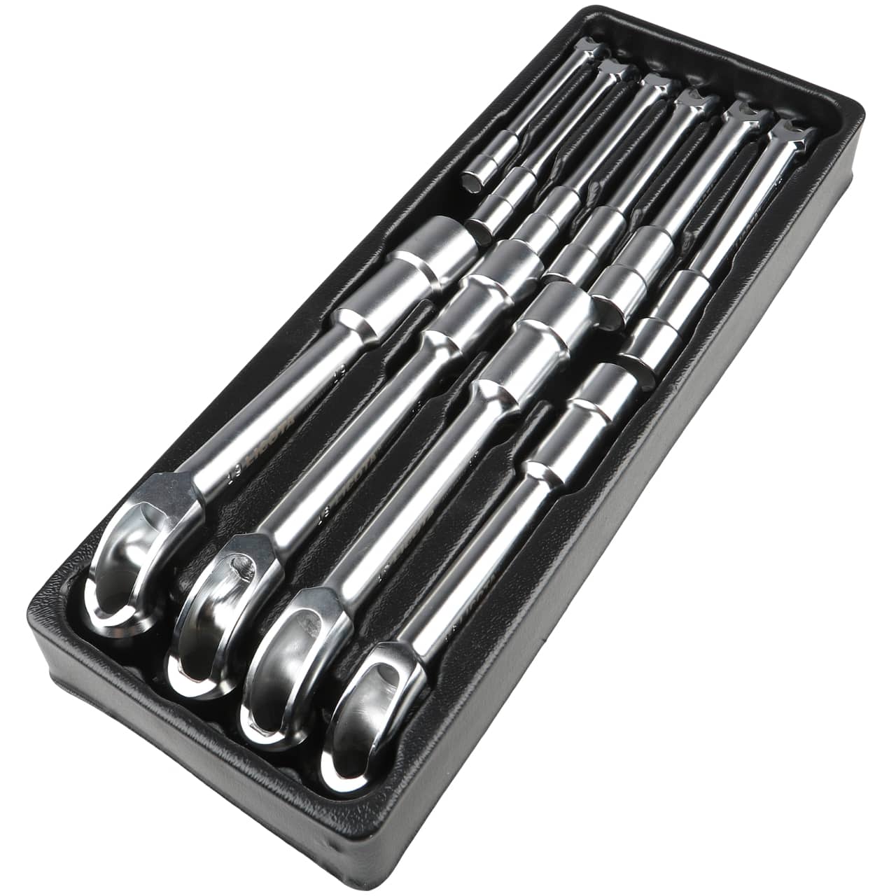 Набор гаечных ключей в ложементе удобен для хранения или перевозки. Он не занимает много места, надёжно крепит ключи в своих нишах и легко поместится в ящик инструментальной тележки или верстака.