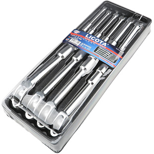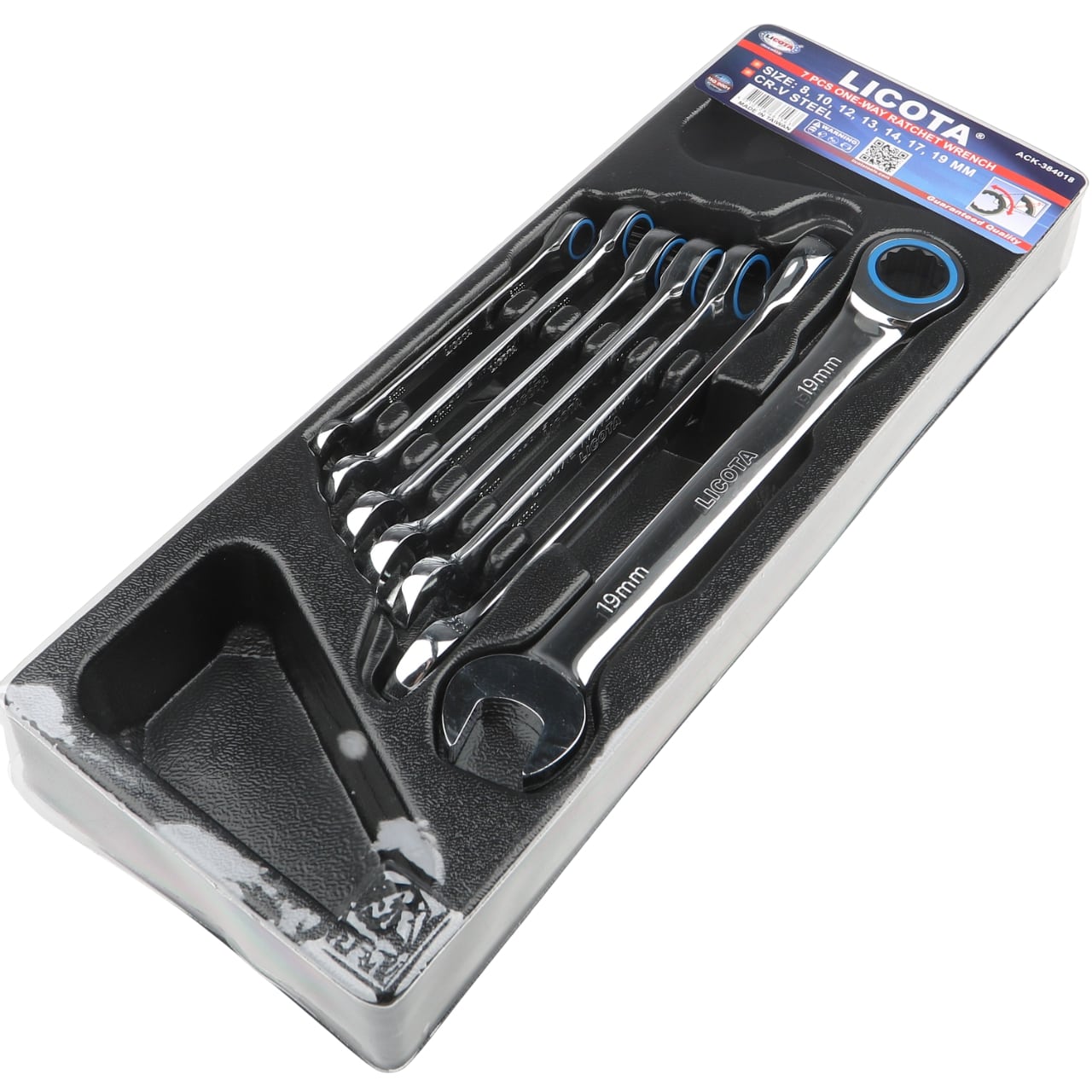 Набор комбинированных трещоточных ключей Licota ACK-384018 состоит из инструментов с рожковым и накидным профилями и подходит для выполнения монтажных/демонтажных работ с гайками, болтами, в том числе для откручивания деталей в труднодоступных местах.