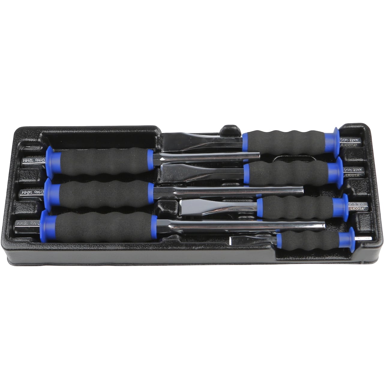 Набор зубил и выколоток Licota ACK-384020. Комплект из 7 предметов в пластиковом ложементе с углублениями под инструмент.