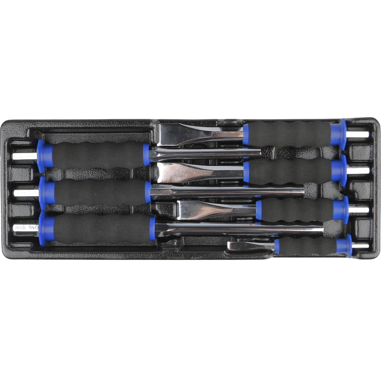 Набор зубил и выколоток Licota ACK-384020. Комплект из 7 предметов в пластиковом ложементе с углублениями под инструмент.