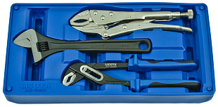 Набор: переставные клещи, ручные тиски струбцина, рулетка Licota ACK-274101. Комплект инструмента из 3 предметов в пластиковом ложементе. Применяется для слесарно-монтажных и кузовных работ.