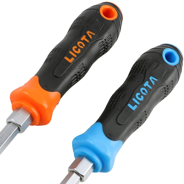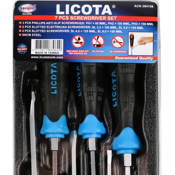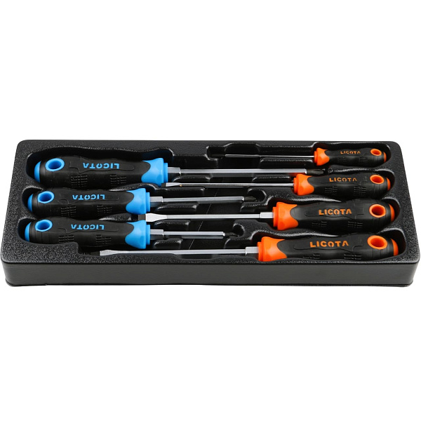 Набор отверток усиленных Licota ACK-384106 из 7 предметов в ложементе. В комплект входят 4 отвертки с профилем SL (шлиц) и 3 отвертки с профилем PH (крест).