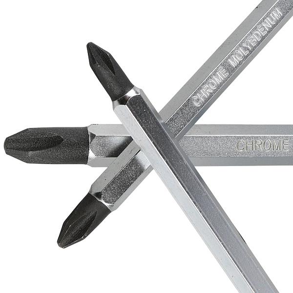 Стержень отвертки из инструментальной стали SNCM, высокоточная фрезеровка шлицев создает устойчивость к динамическим нагрузкам. Фосфатное покрытие рабочих поверхностей предохраняет от коррозии.