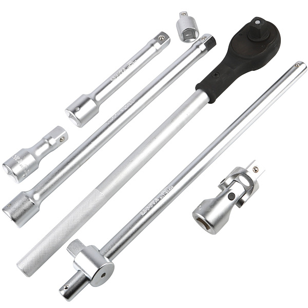 В универсальный набор входят головки, трещотка, вороток, кардан, удлинители и переходники. Комплект применяется при сборке-разборке узлов автомобиля и другой техники.