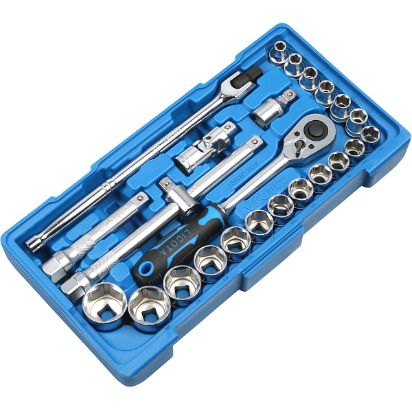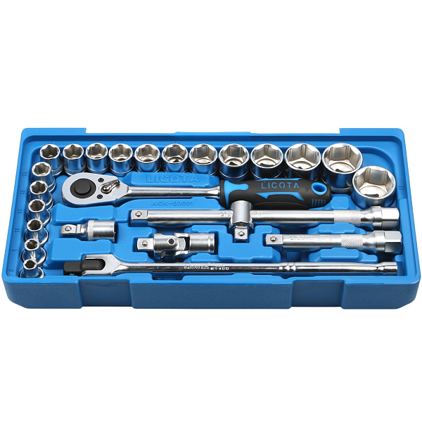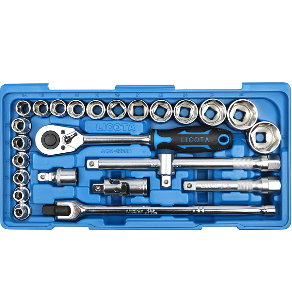 Набор торцевых головок с аксессуарами Licota ACK-B3001 из хром-ванадиевой стали предназначен для ручного монтажа/демонтажа резьбового крепежа.