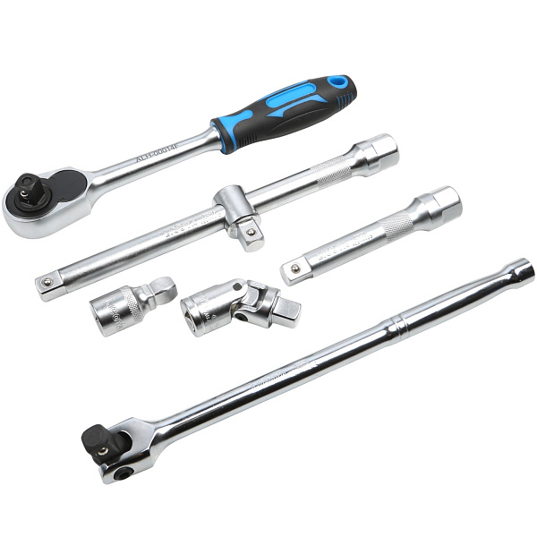 В универсальный набор входят головки, трещотка, вороток, кардан, удлинители и переходники. Комплект применяется при сборке-разборке узлов автомобиля и другой техники.