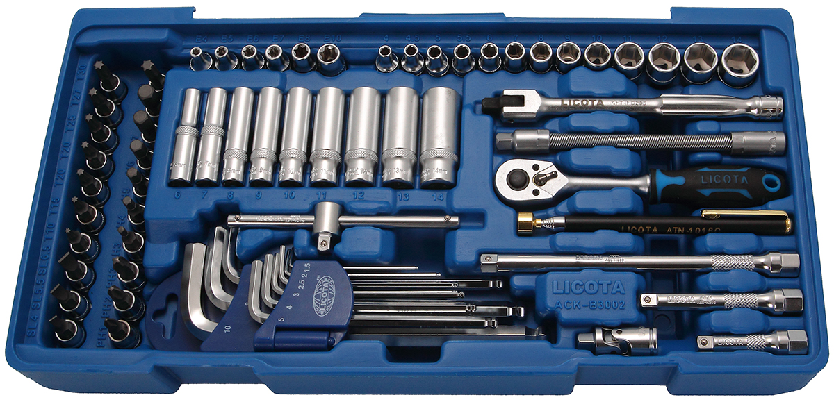 Набор торцевых головок с аксессуарами Licota ACK-B3002 из хром-ванадиевой стали предназначен для ручного монтажа/демонтажа резьбового крепежа.