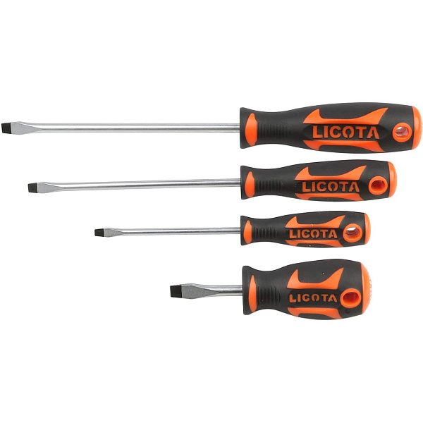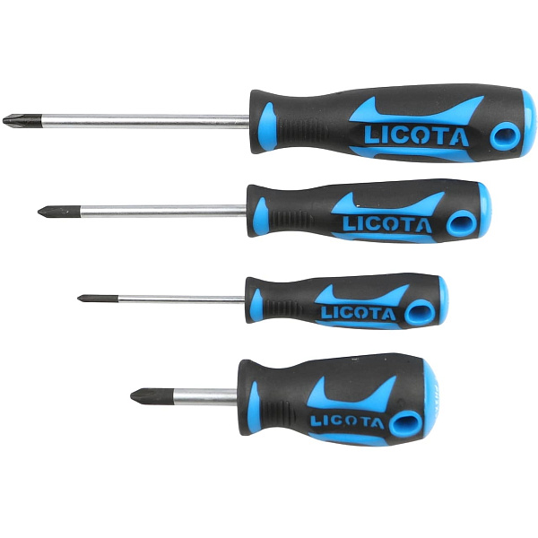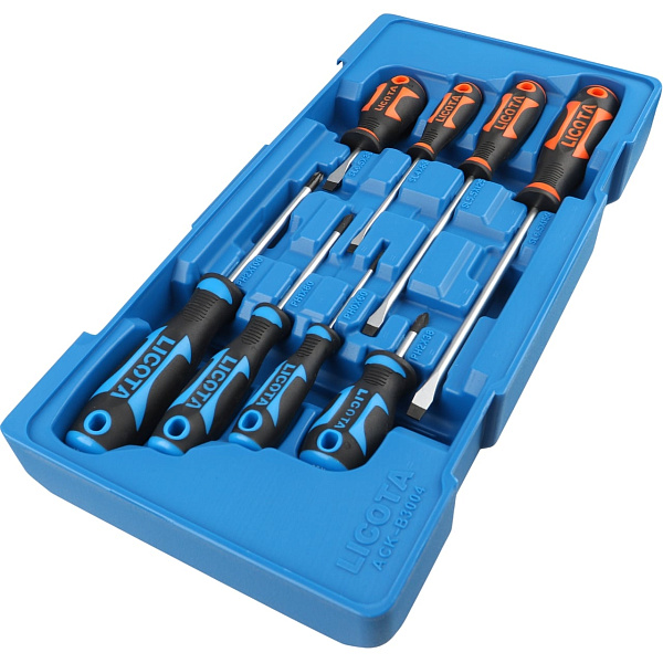 Набор профессиональных отверток Licota ACK-B3004 из 8 предметов в ложементе-кейсе. В комплект входят 4 отвертки с профилем SL (шлиц) и 4 отвертки с профилем PH (крест).