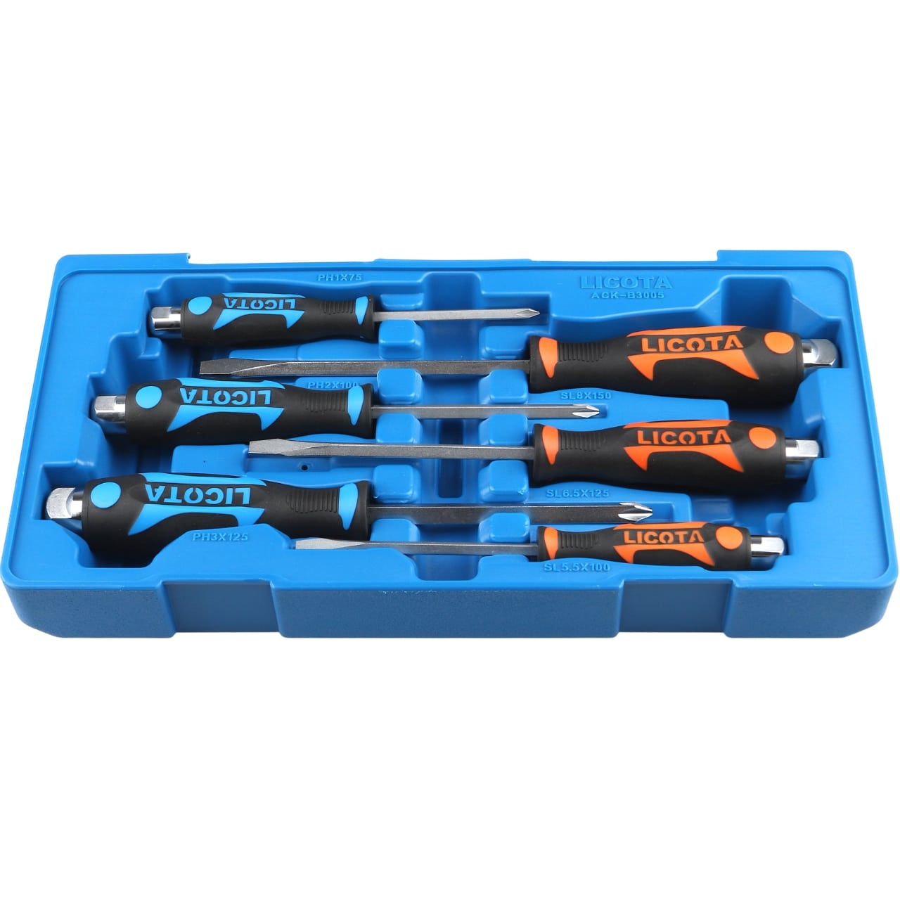 Набор цельнометаллических отверток Licota ACK-B3005 из 6 предметов в ложементе-кейсе. В комплект входят 3 отвертки с профилем SL (шлиц) и 3 отвертки с профилем PH (крест).