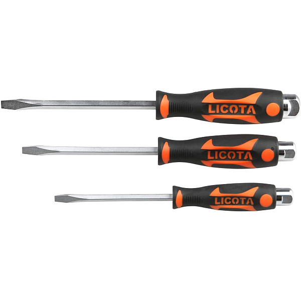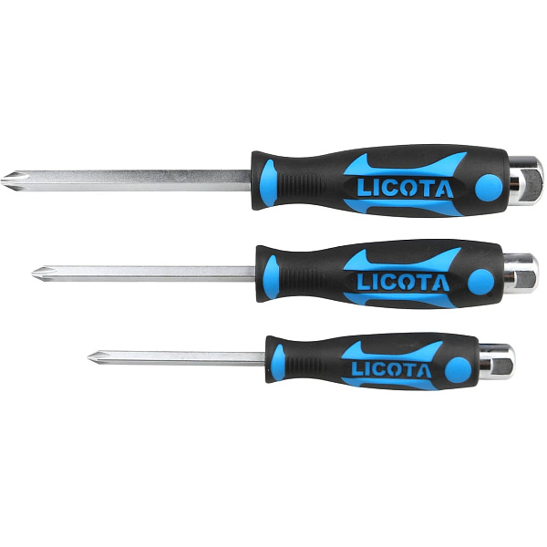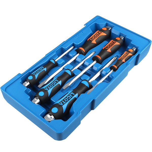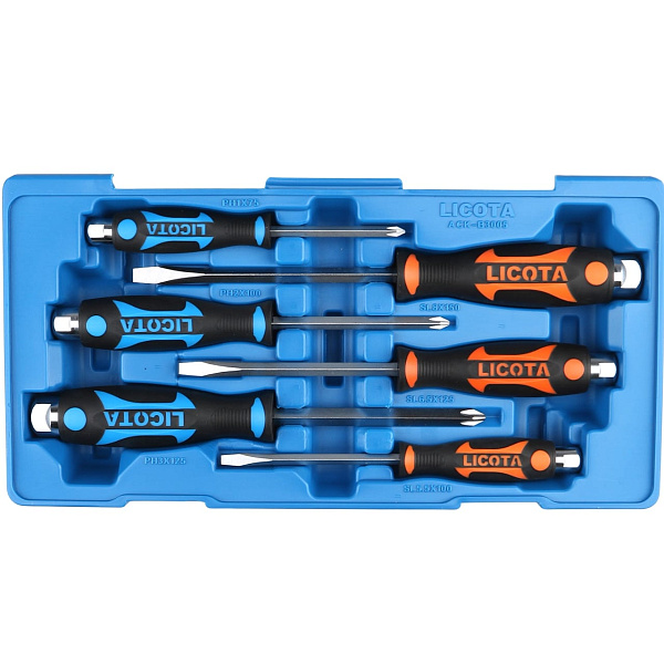 Набор цельнометаллических отверток Licota ACK-B3005 из 6 предметов в ложементе-кейсе. В комплект входят 3 отвертки с профилем SL (шлиц) и 3 отвертки с профилем PH (крест).