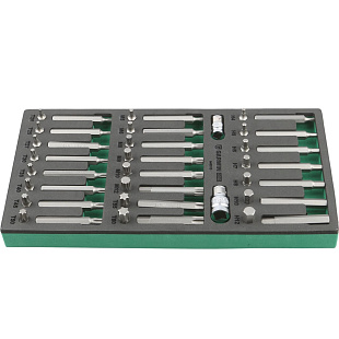 В универсальный набор входят стандартные и удлиненные биты с рабочими профилями HEX (H4-H12), Torx (T20-T70) и Spline (M5-M12). Комплект применяется при сборке-разборке узлов автомобиля и другой техники.