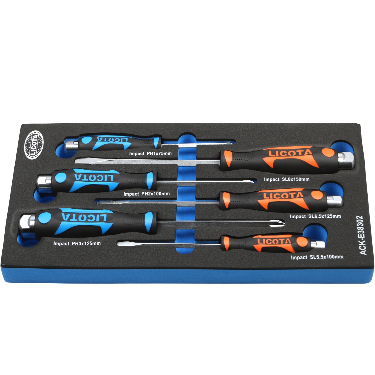 Набор цельнометаллических отверток Licota ACK-E38302 из 6 предметов в ложементе EVA. В комплект входят 3 отвертки с профилем SL (шлиц) и 3 отвертки с профилем PH (крест).