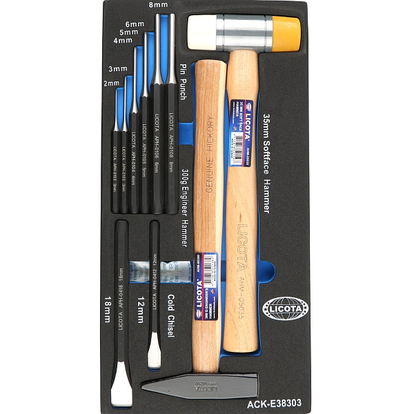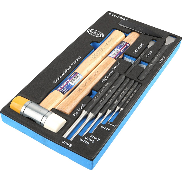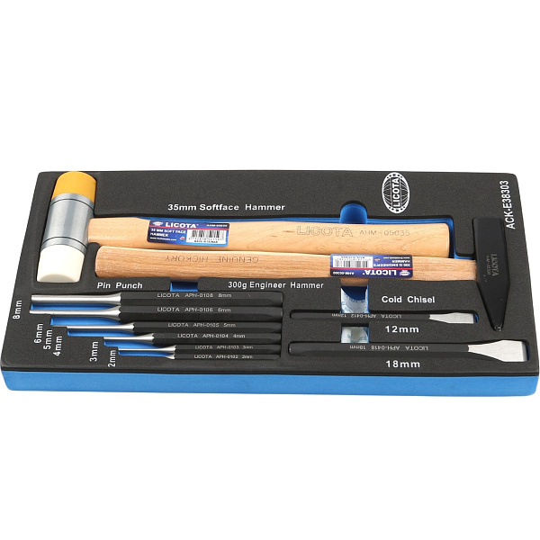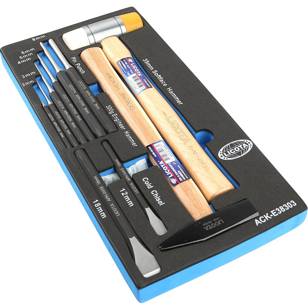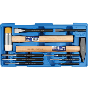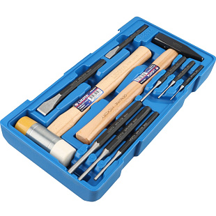 Набор ударно-режущих инструментов Licota ACK-E38303. Комплект вспомогательного инструмента для проведении слесарно-монтажных работ включает в себя молотки (со стальным и мягкими бойками), зубила и выколотки.