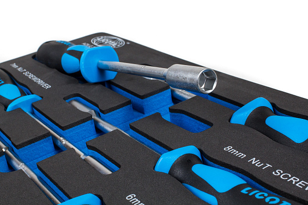 Ложемент позволяет хранить набор в ящиках инструментальной тележки или верстака. Материал EVA (вспененный синтетический каучук) имеет высокую устойчивость к механическим воздействиям, жестко фиксирует инструменты, быстро восстанавливает форму при деформации и не разлагается под действием ГСМ.