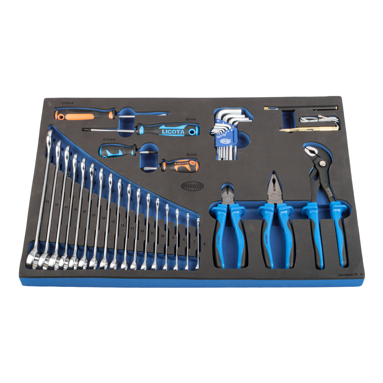 Набор ручных инструментов Licota ALK-8009F1 из 36 предметов. Универсальный комплект состоит из предметов первой необходимости: набора отверток, комбинированных гаечных ключей, Г-образных шестигранных ключей разных размеров, шарнирно-губцевого инструментов и вспомогательного инструмента. Комплект помогает выполнять перечень работ, связанных с ремонтом автомобилей, и прочей техники как в быту, так и на производстве.
