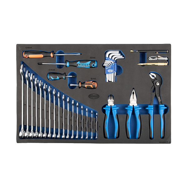 Набор ручных инструментов Licota ALK-8009F1 из 36 предметов. Универсальный комплект состоит из предметов первой необходимости: набора отверток, комбинированных гаечных ключей, Г-образных шестигранных ключей разных размеров, шарнирно-губцевого инструментов и вспомогательного инструмента. Комплект помогает выполнять перечень работ, связанных с ремонтом автомобилей, и прочей техники как в быту, так и на производстве.