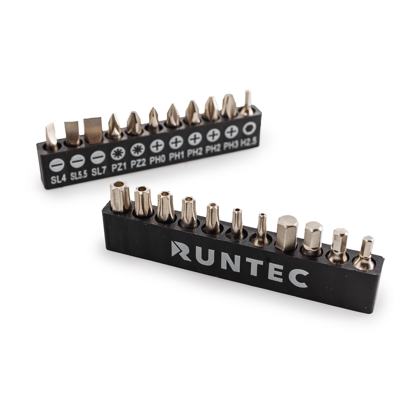 Биты ¼" 25 мм: SL: SL4, SL5.5, SL7. PH: PH0, PH1, PH2 (2шт), PH3. PZ: PZ1, PZ2. HEX: H2.5, H3, H4, H5, H6. TH10, TH15, TH20, TH25, TH27, TH30, TH40 - 22