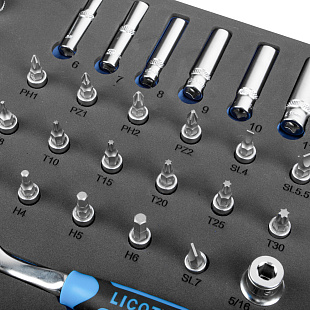 Шестигранные торцевые головки и аксессуары изготовлены из износостойкой закаленной хромованадиевой стали. Биты ¼" и 5/16" — из стали S2 с повышенной устойчивостью к истиранию.