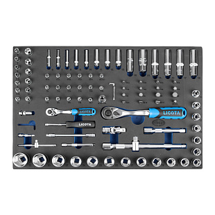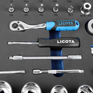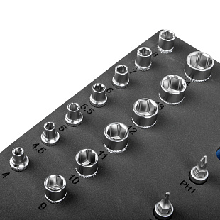 Набор включает в себя широкий диапазон размеров стандартных и глубоких торцевых головок из 52 предметов, включая головки с Е-профилем, а также 2 магнитные свечные головки 1/2": 16 и 21 мм.