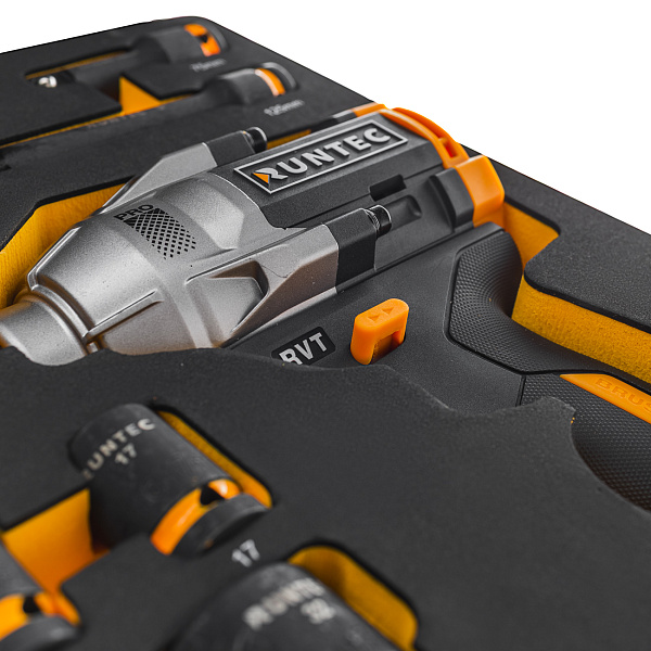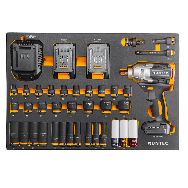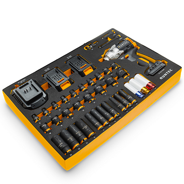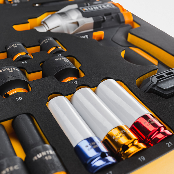 Набор с аккумуляторным гайковертом, ударными головками и аксессуарами RUNTEC 1/2", 8-32 мм, CrMo в ложементе EVA, 39 пр., RT-IWIS1E39F