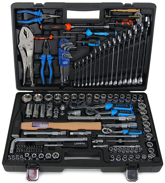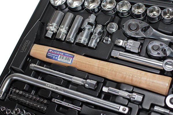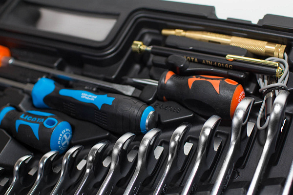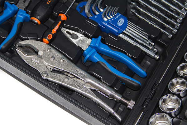 В наборе собран широкий спектр головок на 1/4”, 1/2” и 3/8”, а также аксессуаров к ним - удлинители, воротки и адаптеры. Кроме того, в него входят отвертки, молоток, шарнирно-губцевый и другой инструмент. Благодаря этому, с помощью набора можно решить практически любую задачу в быту, автосервисе или на производстве.